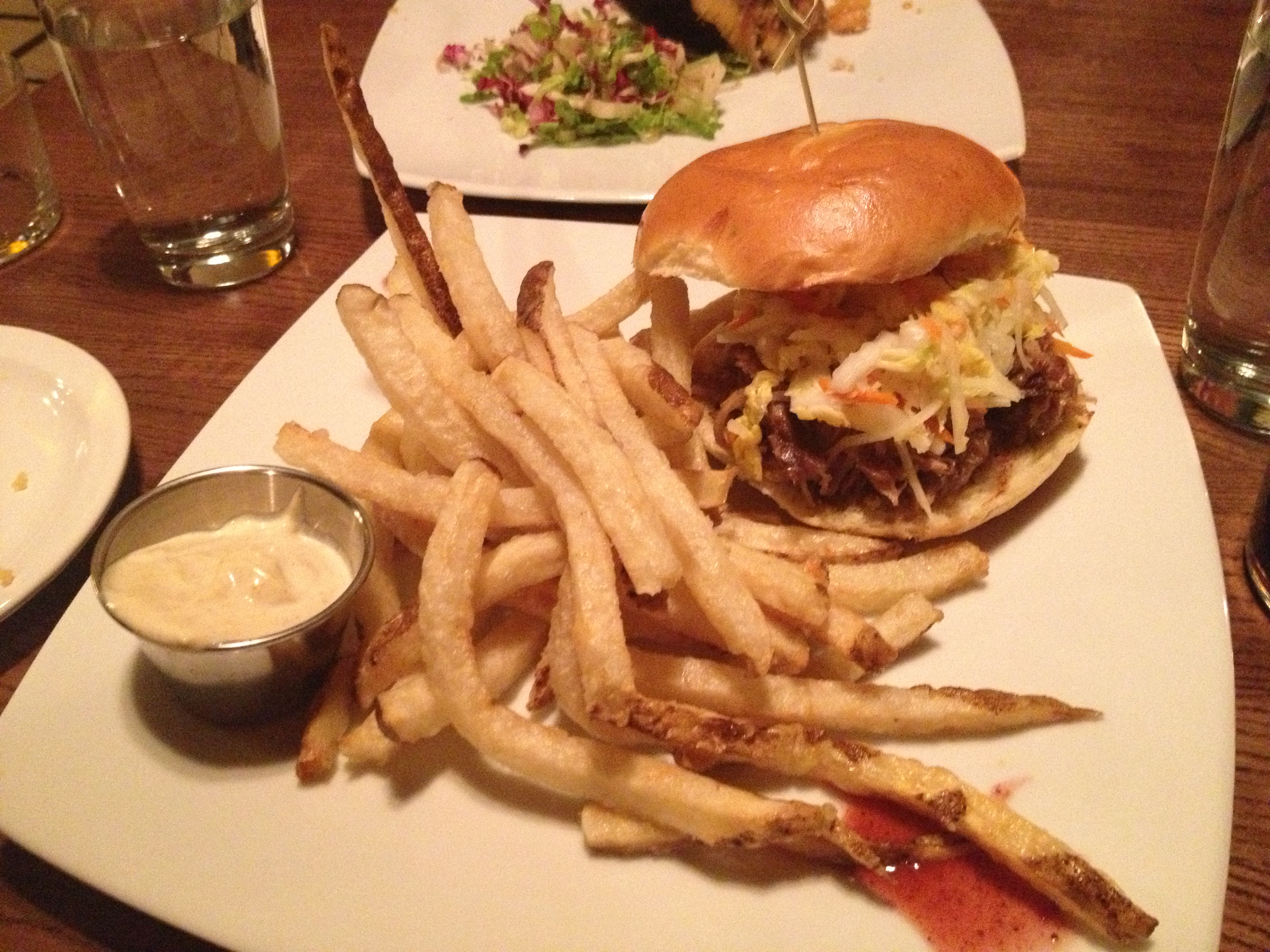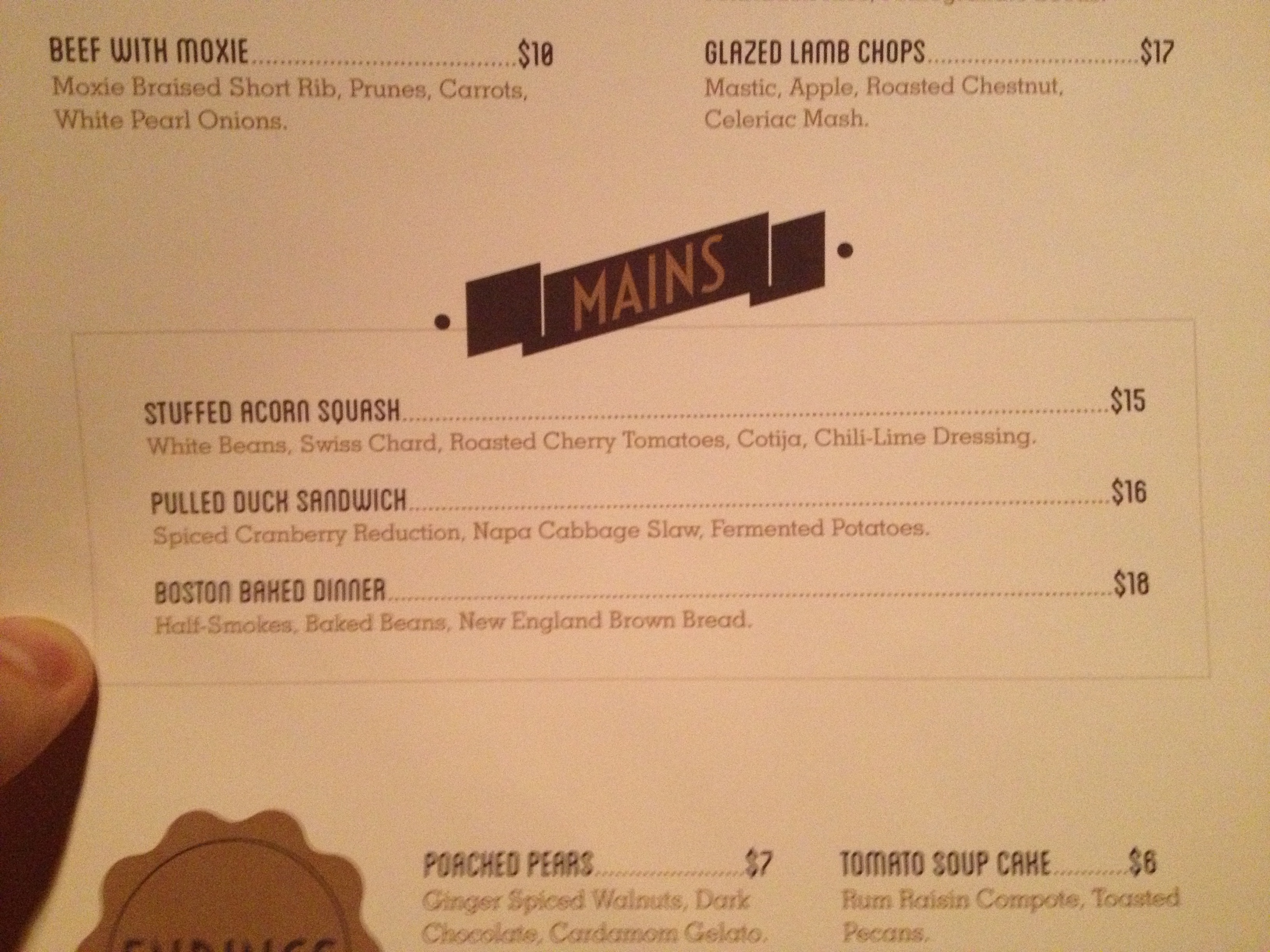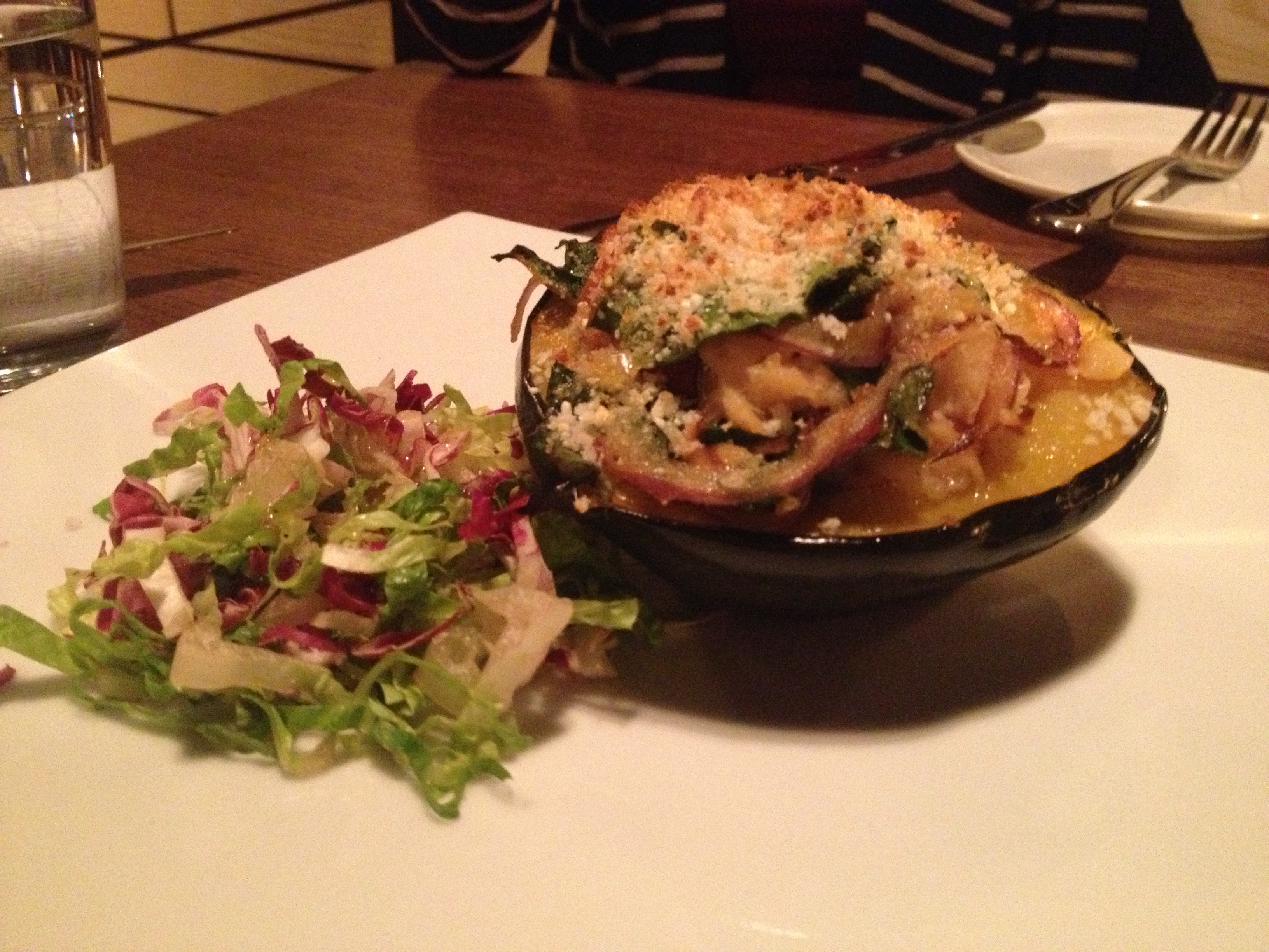 And as far as the food goes, we have sampled a few items of the menu and here are our thoughts: Their pulled duck sandwich was good but a bit on the dry side (in our opinion, the spiced cranberry reduction was so good that it should have been part of the sandwich and not a decoration on the plate). The savory cheese plate was well-rounded, satisfying, and included nice accoutrements like a ground nut paste and salami. The mixed olives were surprisingly warm and had a strong yet elusive taste of fresh orange. And our favorite dish so far has been the stuffed acorn squash – it was fantastic. Even strict carnivores were impressed by the vegetarian dish topped with chili-lime dressing (click on our picture to the right to see it up close and begin salivating).